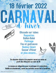 À l’approche de la relâche scolaire, nous souhaitons souligner le début des vacances lors de notre carnaval d’hiver annuel, le vendredi 18 février prochain.