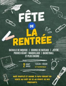Notre traditionnelle fête de la rentrée aura lieu le vendredi 2 septembre. Pour l’occasion, les élèves pourront porter la tenue sportive du collège toute la journée. Voici le déroulement de la journée et les activités qui seront offertes à l’extérieur sur le terrain du Collège.