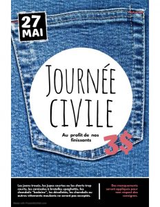 Les finissants de la 5e secondaire organisent une journée civile le vendredi 27 mai prochain. Les élèves peuvent être en tenue civile toute la journée.