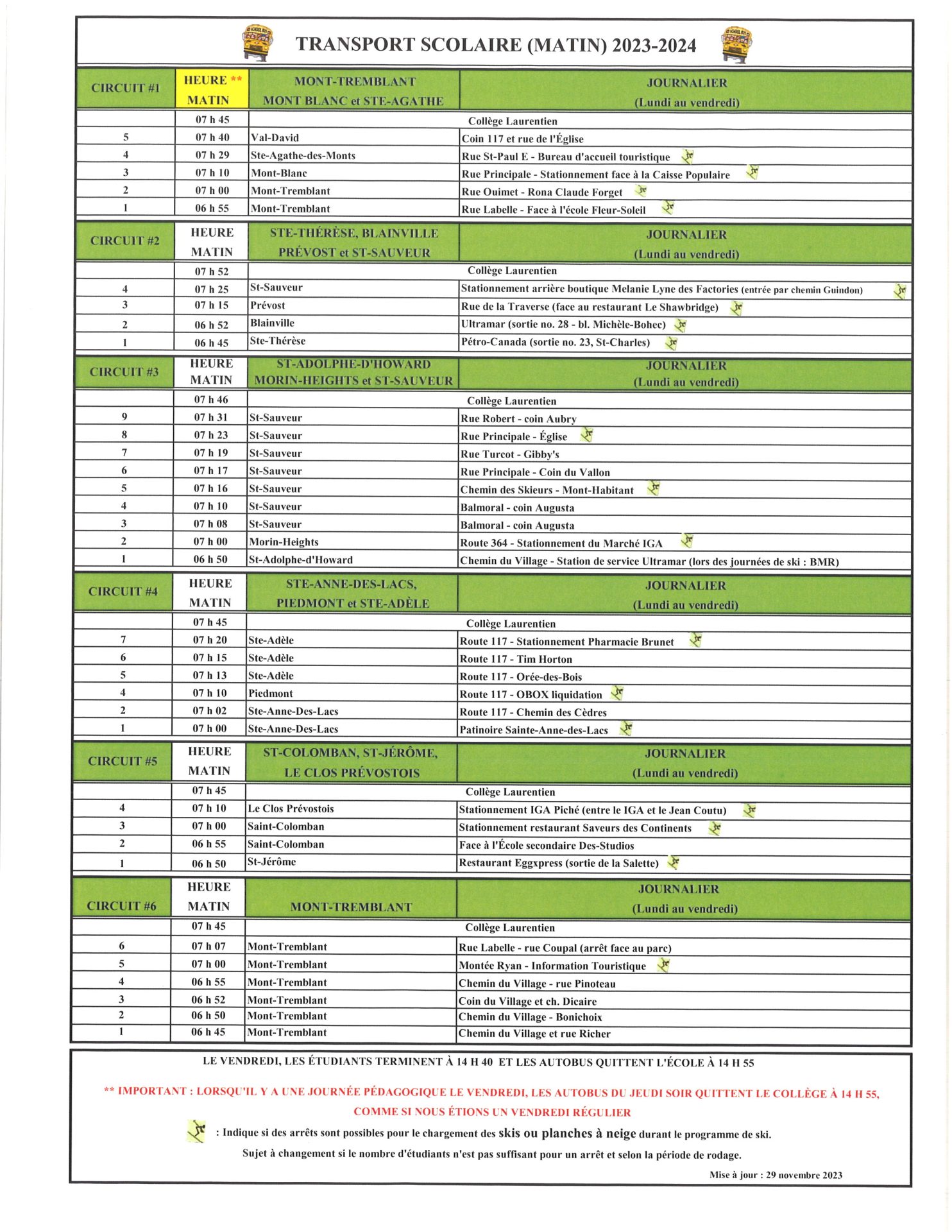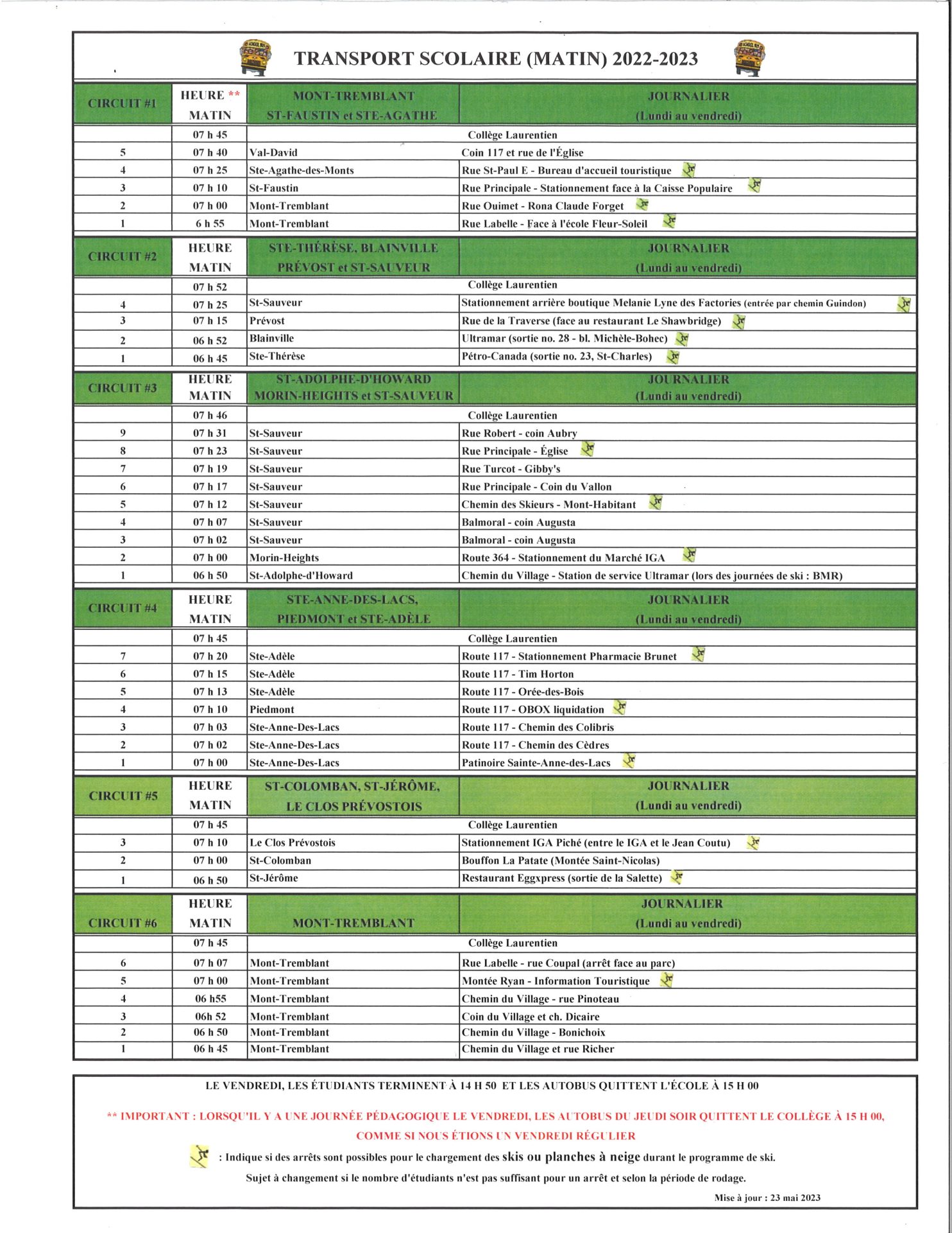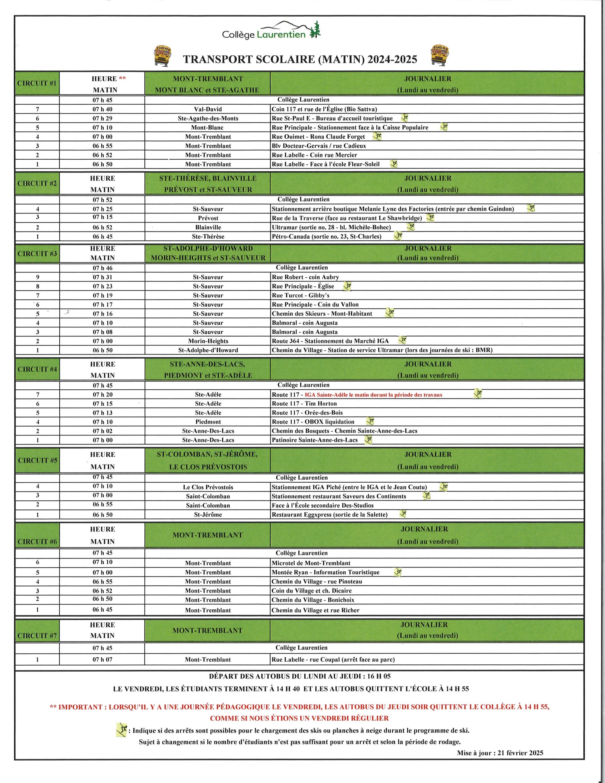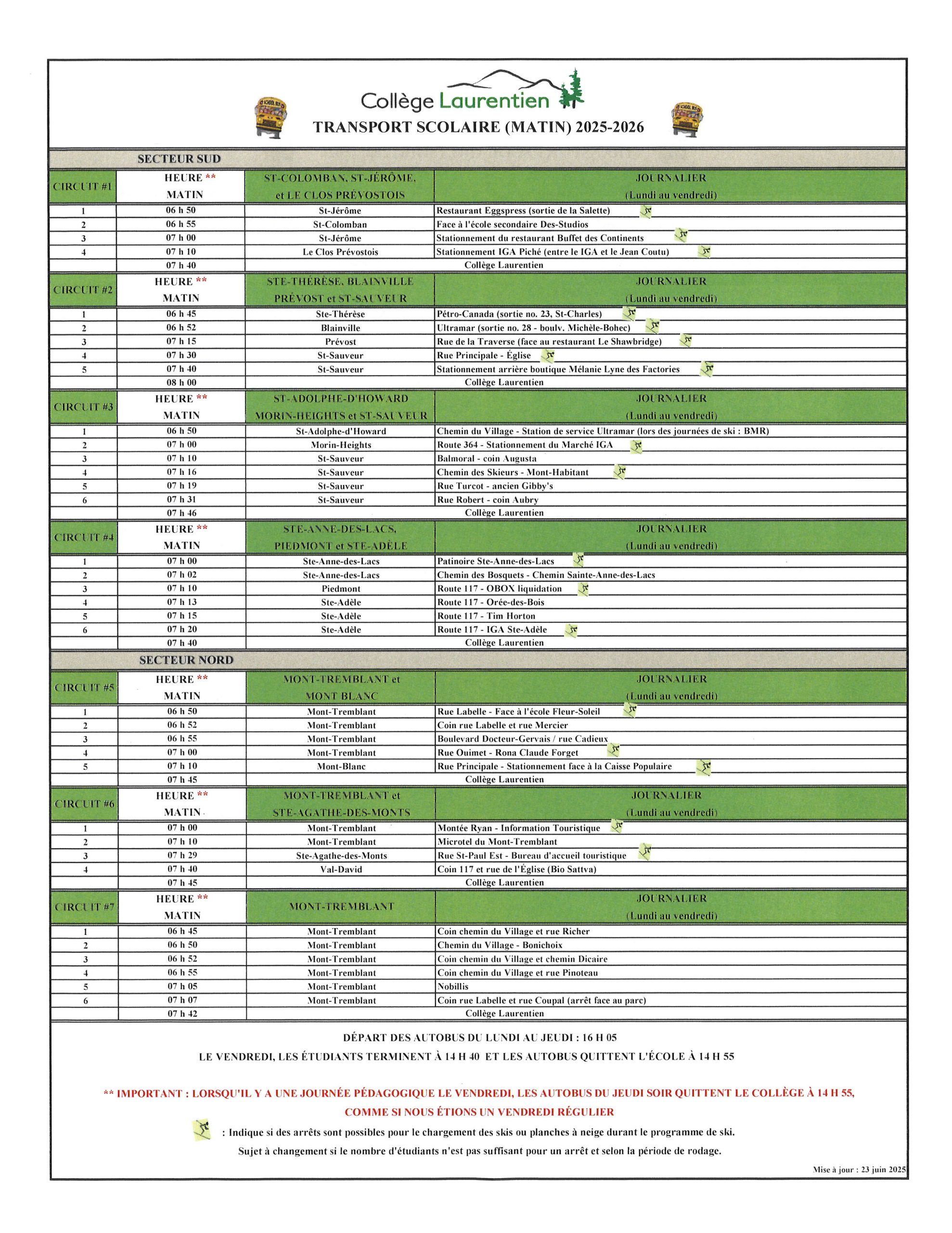 - Départ des autobus à 14 h 55 (le vendredi ou le jeudi lorsqu’il y a une journée pédagogique le vendredi).